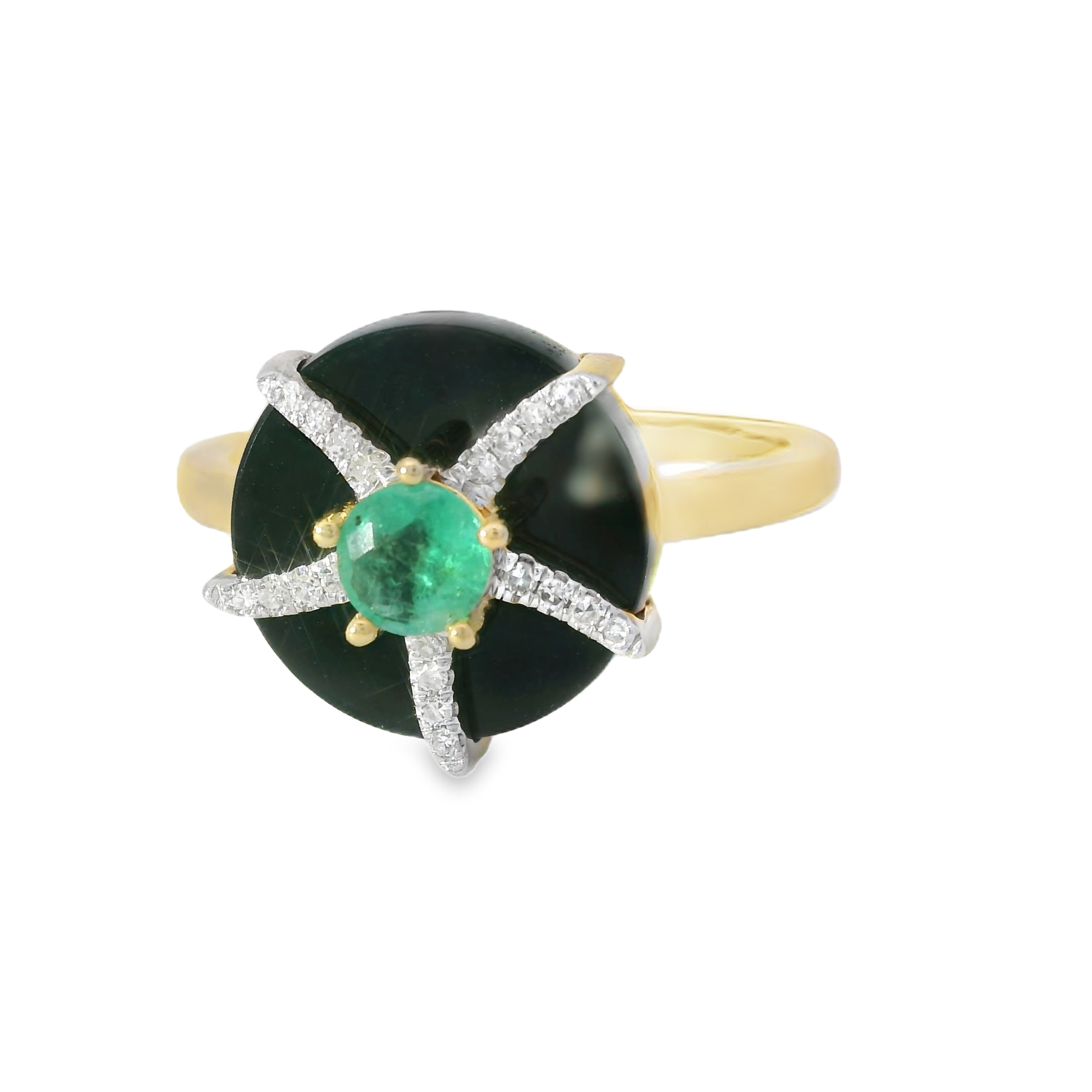 0.08 CT Diamond and 0.23CT Emerald with Black Agate Ring 14K Yellow Gold