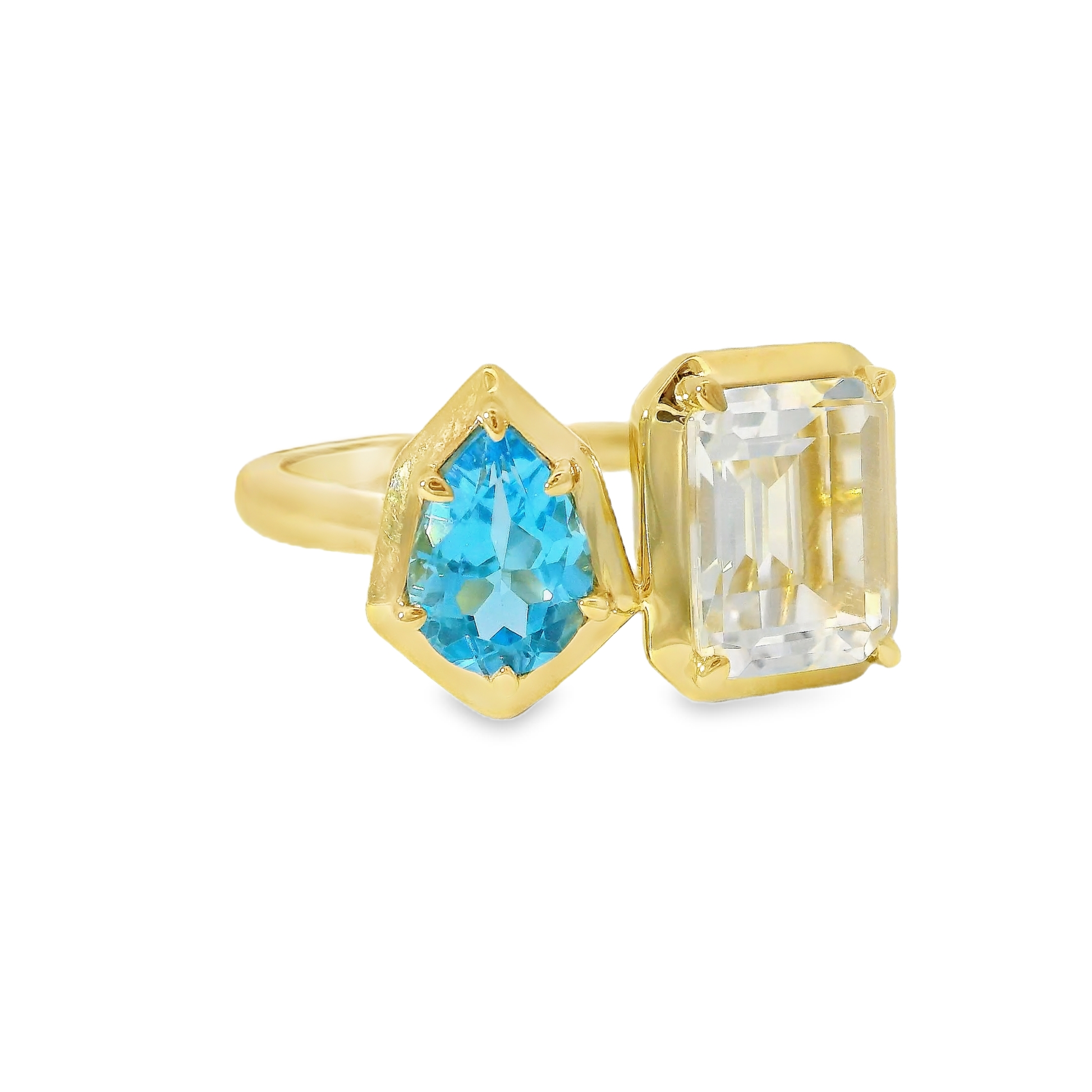 This 14K yellow gold ring features a stunning combination of a 0.73CT blue topaz and 1.89CT white topaz. The brilliance of these gemstones is enhanced by the high-quality gold setting. Elevate your style with this elegant and eye-catching ring.